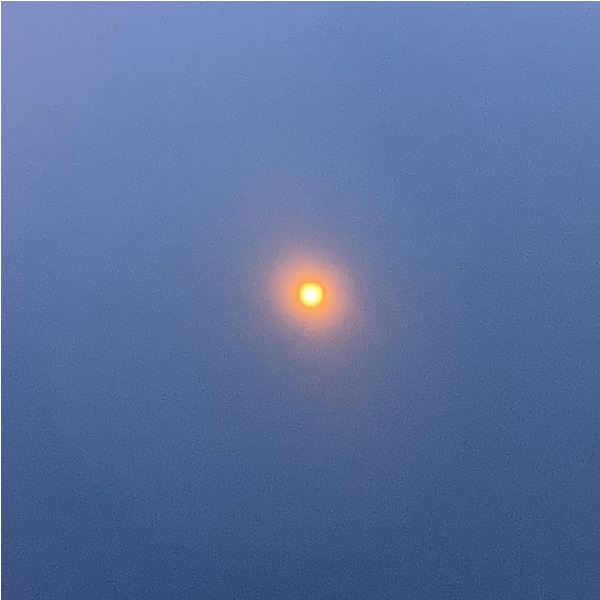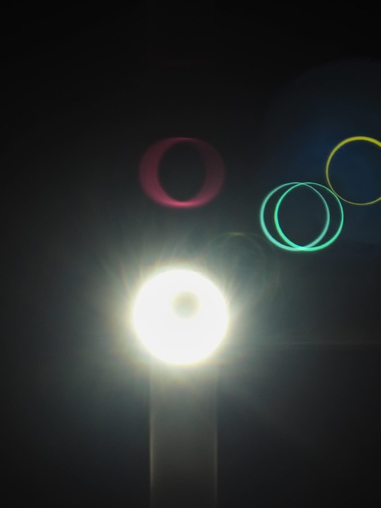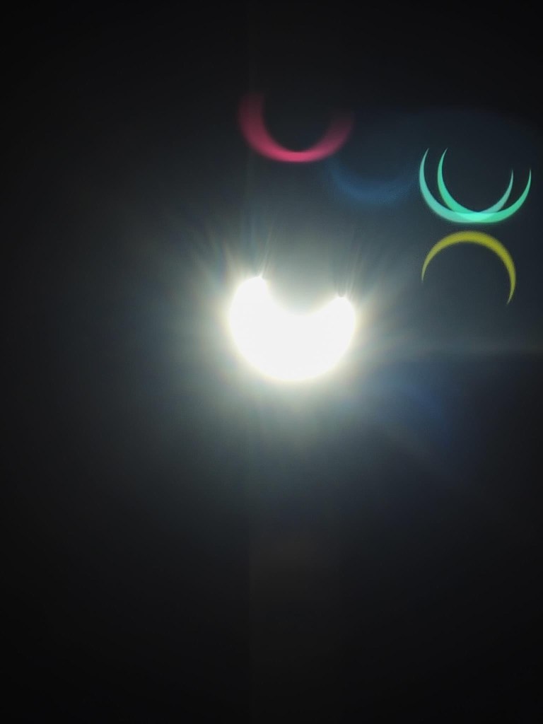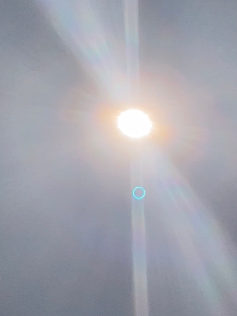 When taking a picture without the eclipse glasses between the phone and the sun, the sun’s rays are overpowering, and the shape of the eclipse cannot be seen clearly. However, the phone also generates a ghost image, showing the actual shape but reflected upside down (and stretched a bit), which can be seen near the bottom of the picture.