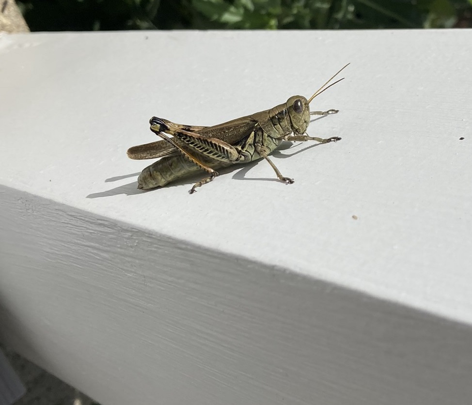 A grasshopper on a front porch post: